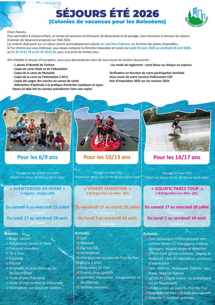 Cet été, des séjours sont proposés aux enfants et ados boisséens de 6 à 17 ans. Si vous êtes intéressé, contactez la Direction Education et Loisirs du lundi 23 mars 2026 au vendredi 24 avril 2026, au 01 45 10 61 78 ou 01 45 10 61 62, pour une prise de rendez-vous.